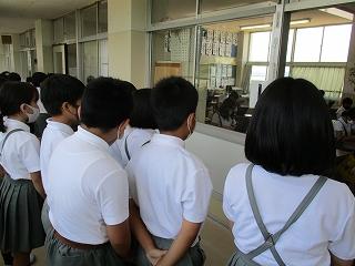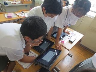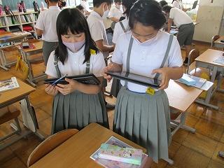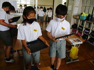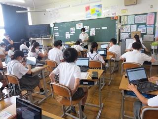 今日は、5年生の道徳の授業を参観しました。5年生の教室では、4月から、自分の生き方について、個々の思いを気兼ねなく正直に出し合う授業が、積み重ねられています。今日のテーマは「美しい心」で、価値あるものへの畏敬の念をもつことが学習のねらいです。タブレットを使用し、互いの意見を画面上で見合いながらの意見交流が行われていました。子供たちは、タブレットでの学習に手慣れたもので、考えを打ち込み、互いに読み合い、自分と異なる意見の人同士で交流し合うという流れで、協働的に学び合っていました。新しい授業に、チャレンジする先生方もどんどん増えてきています。ちょうど、授業を互いに見合う週間にもなっており、4年生が廊下からその様子を参観していました。