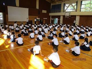 8月24日(月)、元気な子どもたちの姿が学校にあふれました。気持ちも新たに2学期を迎えるため、1限目は、体育館で2学期の始業式を行いました。密集しないように、高学年の部と低学年の部に分かれて行いました。