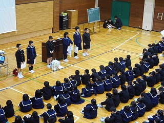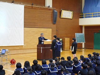 全校集会では、校内書初め大会と英語スピーチコンテストの表彰伝達、校長先生のお話、生活や学習についてのお話がありました。