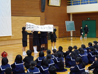 はじめに児童集会です。自然環境委員会からペットボトルキャップ、5年生からは6年生を送る会のスローガンについての発表でした。