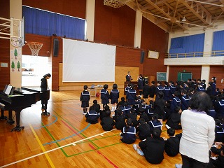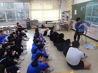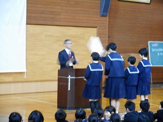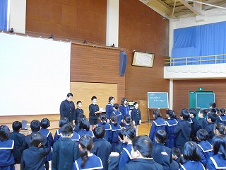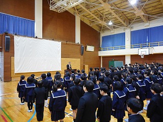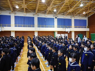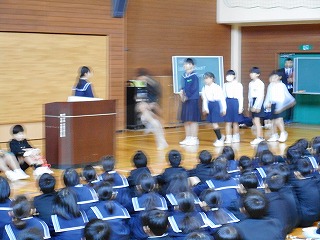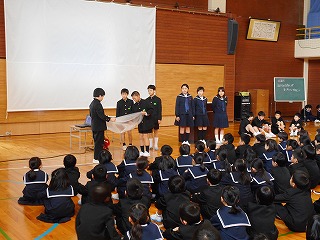 前半は児童集会でした。12月初めの全校集会で発表ができなかった給食委員会(寸劇)、体育委員会(なわとび演技)の発表がありました。その後、図書委員会(表彰)の発表がありました。