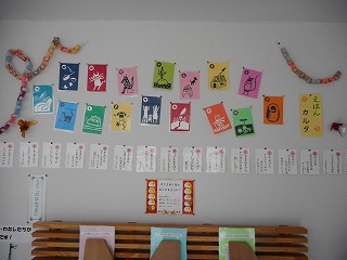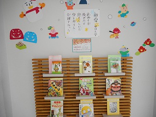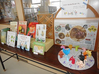 今月の図書館前の掲示は、ねずみ年にちなんだもの、伝統芸能に関するもの、えほんかるたなど、正月にちなんだ掲示です。とてもすてきな掲示です。
