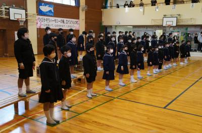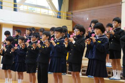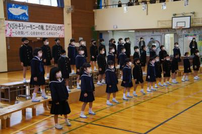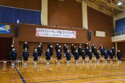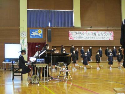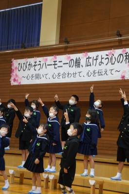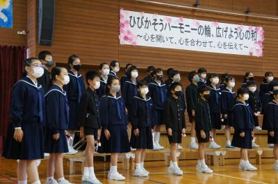「ひびかそうハーモニーの輪 広げよう心の和」をテーマに音楽集会が開催され、毎日の練習の成果を披露しました。