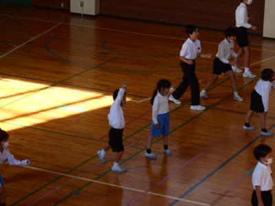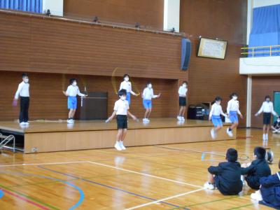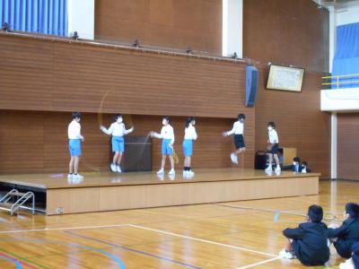 児童集会では体育委員会から「なわとびがんばり運動」についての発表があり、ステージ上で技をたくさん披露してくれました。