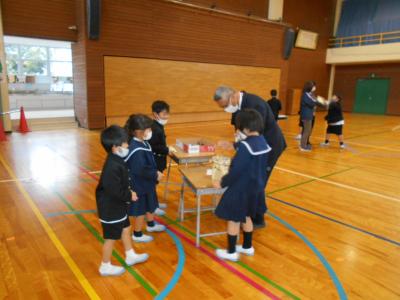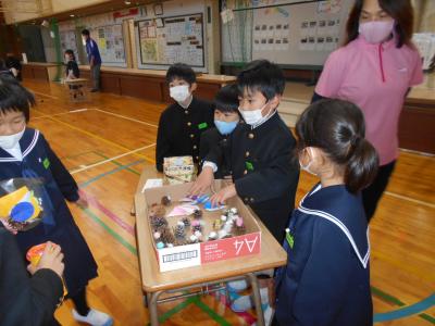 アタリがでたら、かわいらしい松ぼっくりがもらえます。校長先生も挑戦!