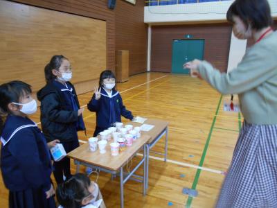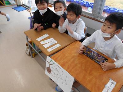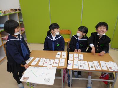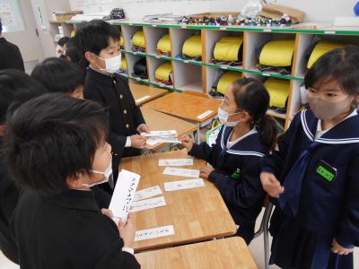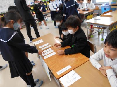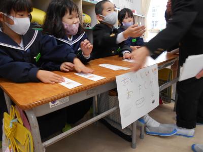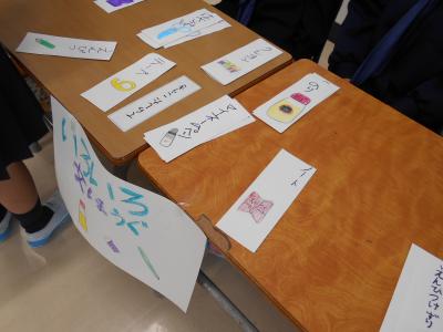 1年生が国語の授業で「ものの名まえ」を学習し、いろんな名まえのカードを使ってお店をオープンしました。