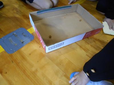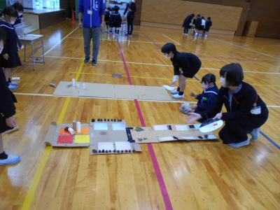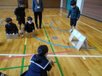 うちわに乗せて運んだ松ぼっくりでボーリング!教頭先生とどっちが早いかな?