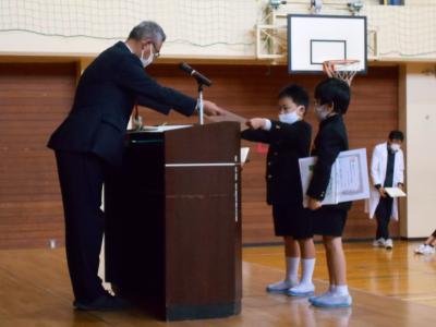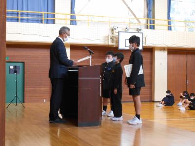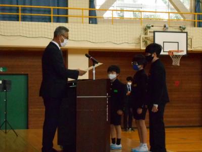 全校集会では様々な大会やコンクールで入賞したみなさんの表彰がありました。