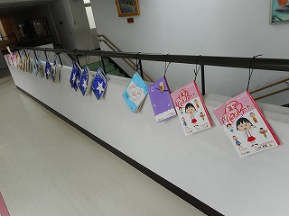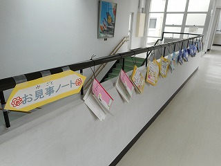 2階中央階段廊下に各クラスで優秀なノートを展示してあります。となりのクラス、他の学年の素敵なノートを見ることができて、「自分も頑張ろう!」という気持ちになる児童が多いです。