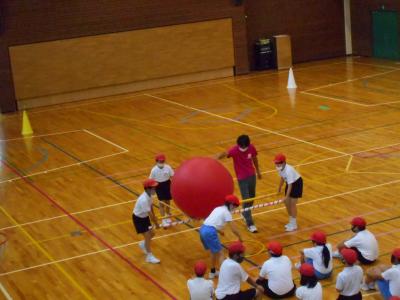 まず各チームで作戦を練ってから実際に大玉を運んでみました。
