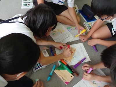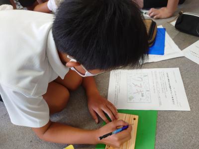 次は下書きをもとに木のプレートに描いていきました。