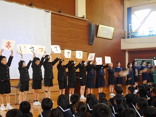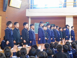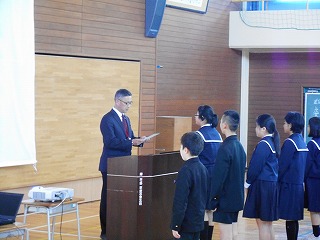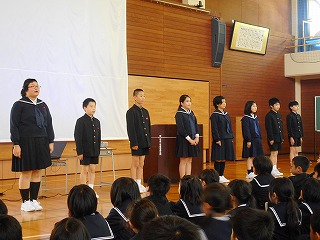 5限目の集会で、委員会の委員長のみなさん、3年生以上の学級代表のみなさんの任命式がありました。委員会のみなさんはがんばることを一人ずつ話しました。