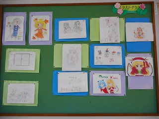 会議室前廊下にイラストクラブのみなさんのイラストが掲示してあります。