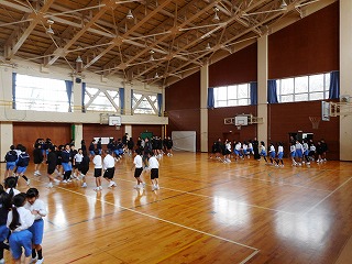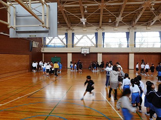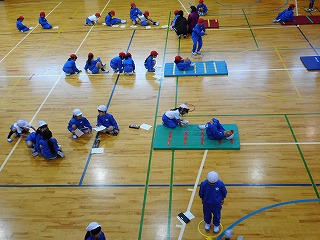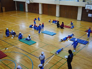 1年生のみなさんは、体育の時間にマットでいろいろな動きを楽しんでいました。転がる動きはとても楽しいようでした。外は雪が降っていましたが、体があったかくなりました。