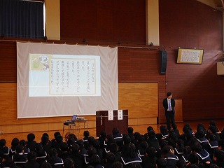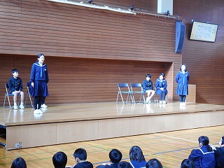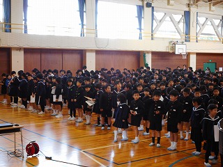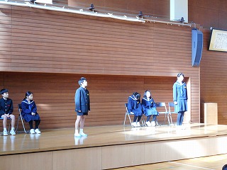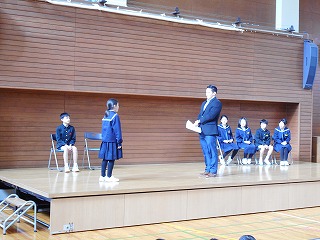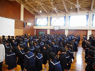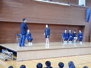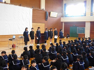 5限目に終業式がありました。はじめに児童集会があり、図書委員会、3年生のみなさんが発表をしました。