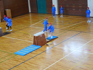 体を温めようと、大縄跳び、跳び箱に一生懸命取り組んでいました。