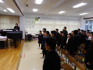 5年生は6年生を送る会で、太鼓の演奏をする予定です。音楽の時間に練習しています。音楽の時間では、はじめに歌を歌います。その後、各パートに分かれて、練習しました。本番までに力強く、感動してもらえるような演奏になるように頑張っています。