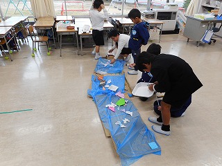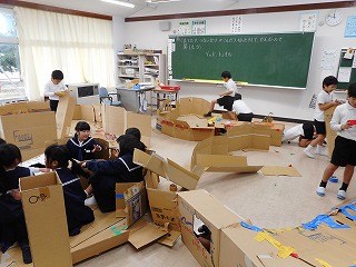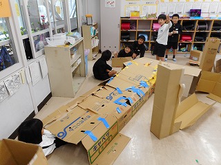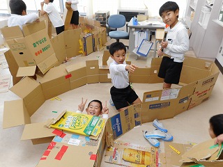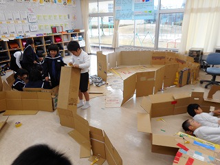 2年生が、段ボールを立てたり、つないだり、切ったりして楽しみました。トンネル、ベッド、家などおもいおもいに作っていました。みんなで大作を完成させ、満足していました。