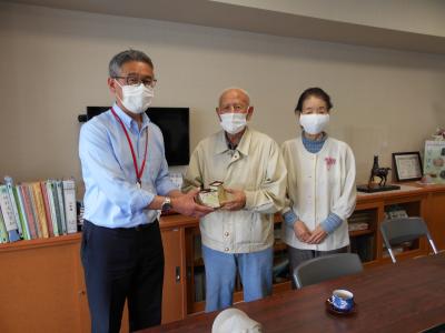 津幡町加賀爪在住の川幡さんから手作りのペン立てをいただきました。