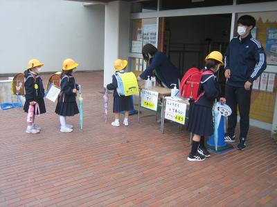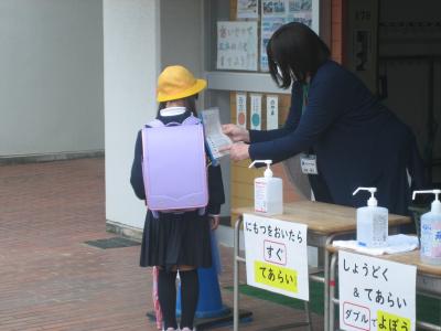 学校では,朝の健康チェック時に全員の手指消毒を行うことを追加し,各教室の出入り口にも消毒を設置しました。