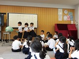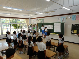 児童集会では、運動会の応援団の紹介、スローガンの紹介、5年1組さんからの劇、図書委員会の皆さんからの表彰、5年生のみなさんの合唱などがありました。