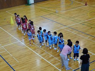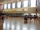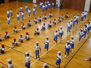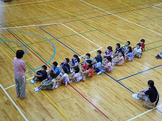 はじめに、体育館でリレーをしました。いっしょうけんめい、走っていました。