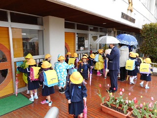 玄関で地区ごとに整列しています