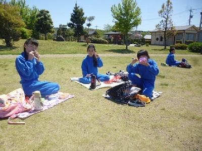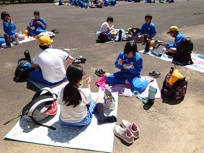 コロナ対策で少しずつ距離をとってお弁当を食べました。