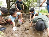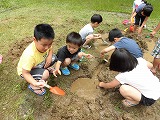 穴を掘って水を貯める子、川を作って水を流す子、山を作ってトンネルを掘る子、どろどろの感触を楽しむ子、いろいろな遊び方をしていました。