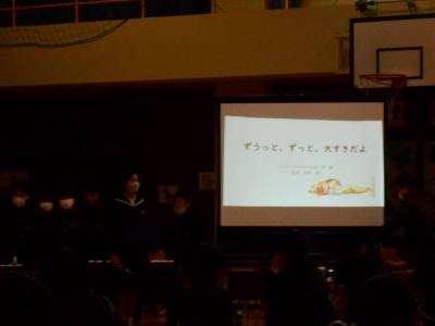 6年生を送る会の後半は、 5年生の「朗読音楽劇 ずうっと、ずっと、大好きだよ」から始まりました。
