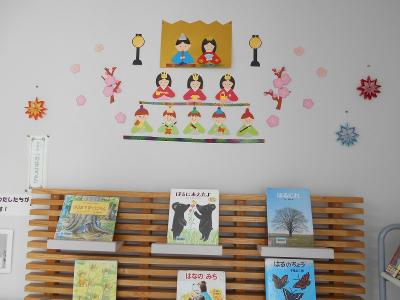 図書館前には、図書ボランティアさんがひな祭りの掲示をしてくれてあります。