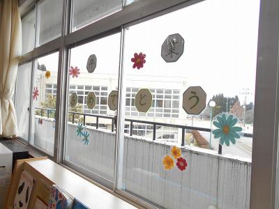 図書館の窓にも「卒業おめでとう」の飾りがあります。