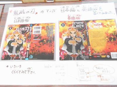映画で大ヒットした「鬼滅の刃」の日本語版と英語版のコミック本を比較したコーナーです。