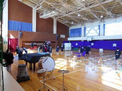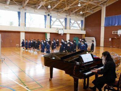 卒業式に参加する5年生も、体育館で入場曲の合奏や歌の練習に取り組んでいます。
