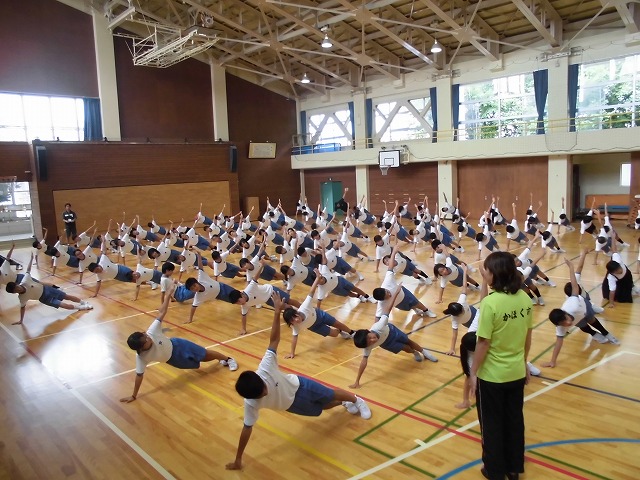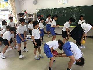 学年登校日に、5・6年生合同で町歌の練習を行いました。昨年も演技した6年生のお手本を見たり、なかよしグループの6年生に教えてもらったりして、少しずつ動きを覚えていきました。