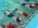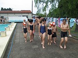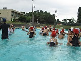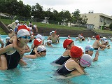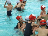6年生と1年生が、一緒にプールに入りました。1年生にとって、初めての深いプールです。初めに6年生からプールでの決まりを教えてもらました。