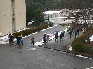 1~6年生までがグループごとに並び、引率の先生と一緒に、危険な場所などを確認しながら下校しました。