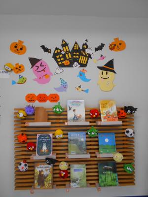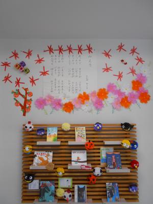 赤とんぼやコスモス、ハロウィンなど、とても秋らしい図書館になりました。