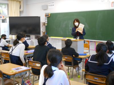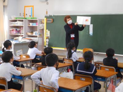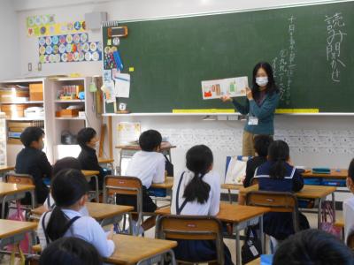 朝学習の時間に、図書ボランティアさんと青木先生、表先生による絵本の読み聞かせが行われました。