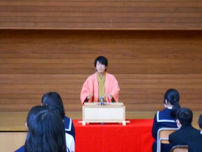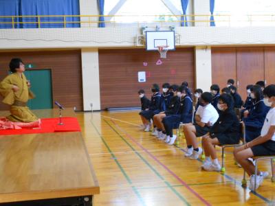 落語の歴史や小道具(手ぬぐい、扇子)の使い方の説明から始まり、落語を2席披露していただきました。