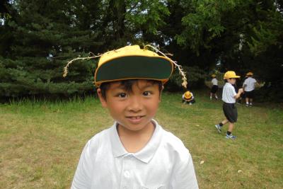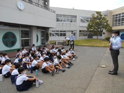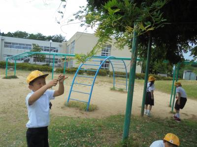 校舎の周りに自然を探しに出かけた1年生。