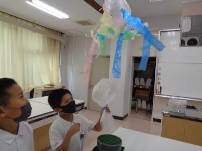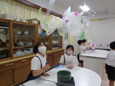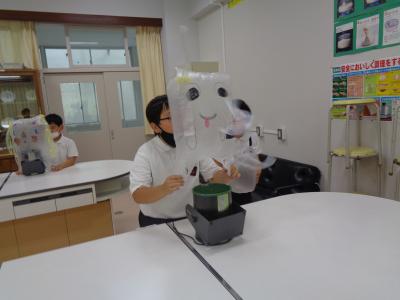 子どもたちは、ふくろに絵を描いたりかざりをつけたりして、送風機で空気を入れました。