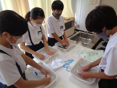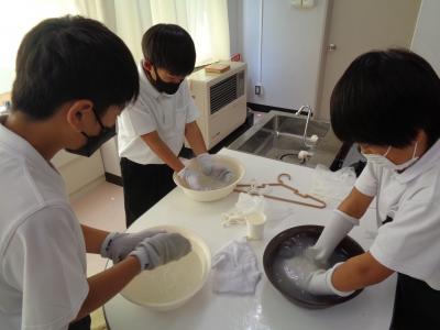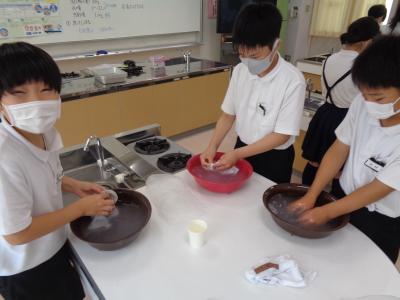 洗剤液をつくり、汚れに合わせてもみ洗いやつまみ洗いをしながら、ていねいに洗っていました。