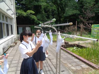 持ってきたハンガーと洗濯ばさみで外に干すと、帰るときには乾いて真っ白になっていました。