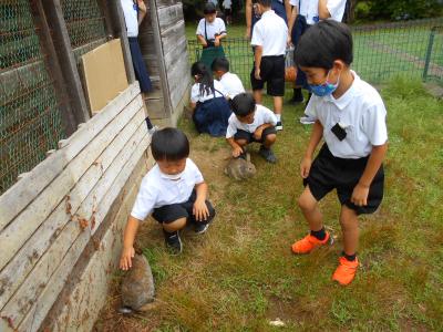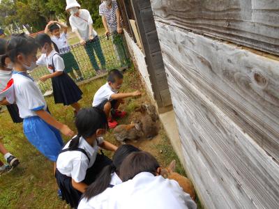 普段は小屋の外から眺めているウサギを間近で見ることができるということで、たくさんの1,2年生が集まりました。
