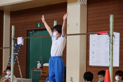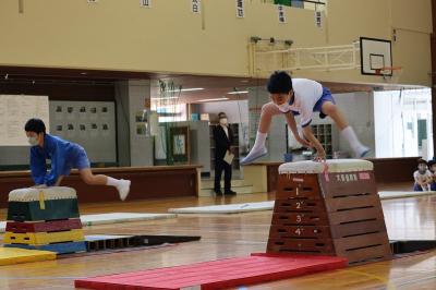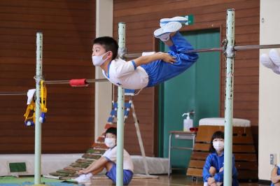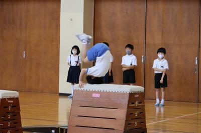 3年生は体育館で、その他の学年は教室で画面越しに3種目(マット・跳び箱・鉄棒)の技を見せてもらいました。
