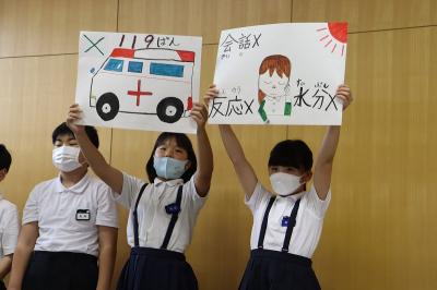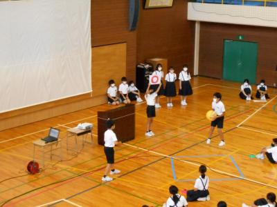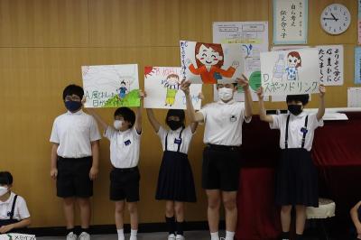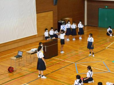 児童集会の中で、保健委員会より熱中症についてのお話がありました。熱中症にならないための対策や、実際になってしまったときの対処法を、クイズをまじえてわかりやすく発表してくれました。