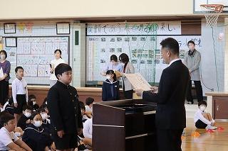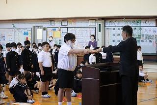 夏休みの課題や絵画・書写コンクール、マラソン大会などの表彰が行われました。