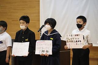 児童集会では、プログラム委員から「あいさつ」についてのお話がありました。