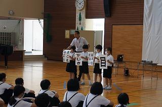 児童集会では、給食委員会から給食クイズの解説、生き物委員会から生き物クイズ、情報委員会から時間に余裕をもって行動する良さを伝えてくれました。